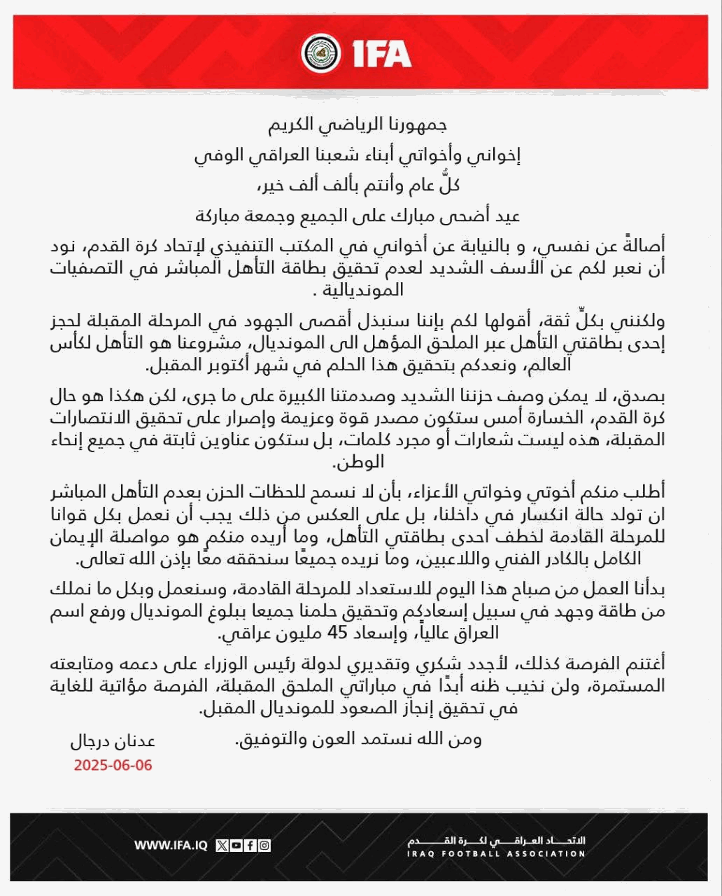 وقال درجال في بيان، ان جمهورنا الرياضي الكريم وإخواني وأخواتي أبناء شعبنا العراقي الوفي، أصالةً عن نفسي، وبالنيابة عن أخواني في المكتب التنفيذي لإتحاد كرة القدم، نود أن نعبر لكم عن الأسف الشديد لعدم تحقيق بطاقة التأهل المباشر في التصفيات المونديالية، ولكنني بكلِّ ثقة، أقولها لكم بإننا سنبذل أقصى الجهود في المرحلة المقبلة لحجز إحدى بطاقتي التأهل عبر الملحق المؤهل الى المونديال، مشروعنا هو التأهل لكأس العالم، ونعدكم بتحقيق هذا الحلم في شهر أكتوبر المقبل.