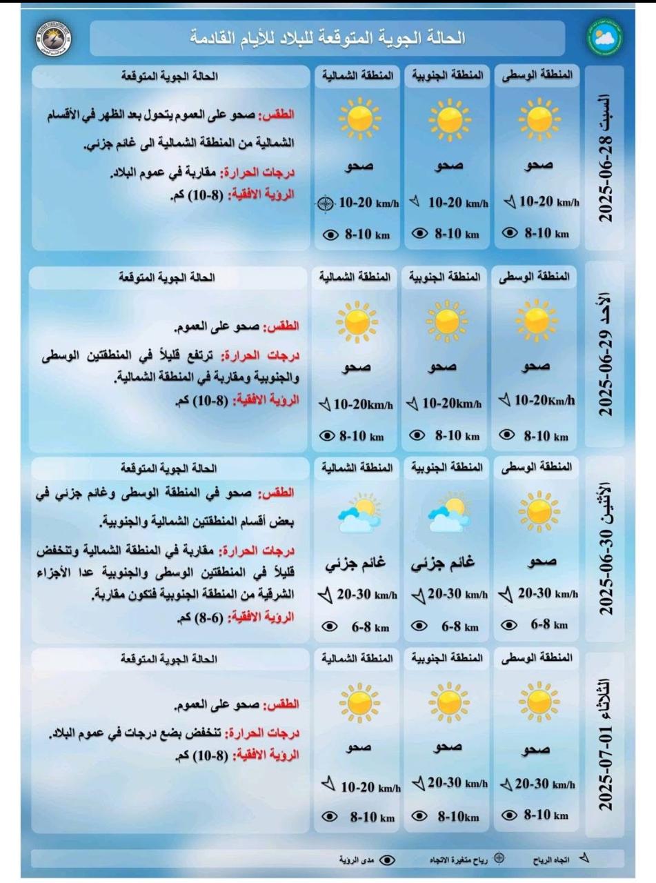 وقالت الهيئة في بيان ، ان "طقس يوم غد السبت سيكون صحواً في عموم مناطق البلاد يتحول بعد الظهر في الاقسام الشمالية من المنطقة الشمالية الى غائم جزئي، بينما ستكون درجات الحرارة مقاربة لليوم السابق في جميع اقسام البلاد".