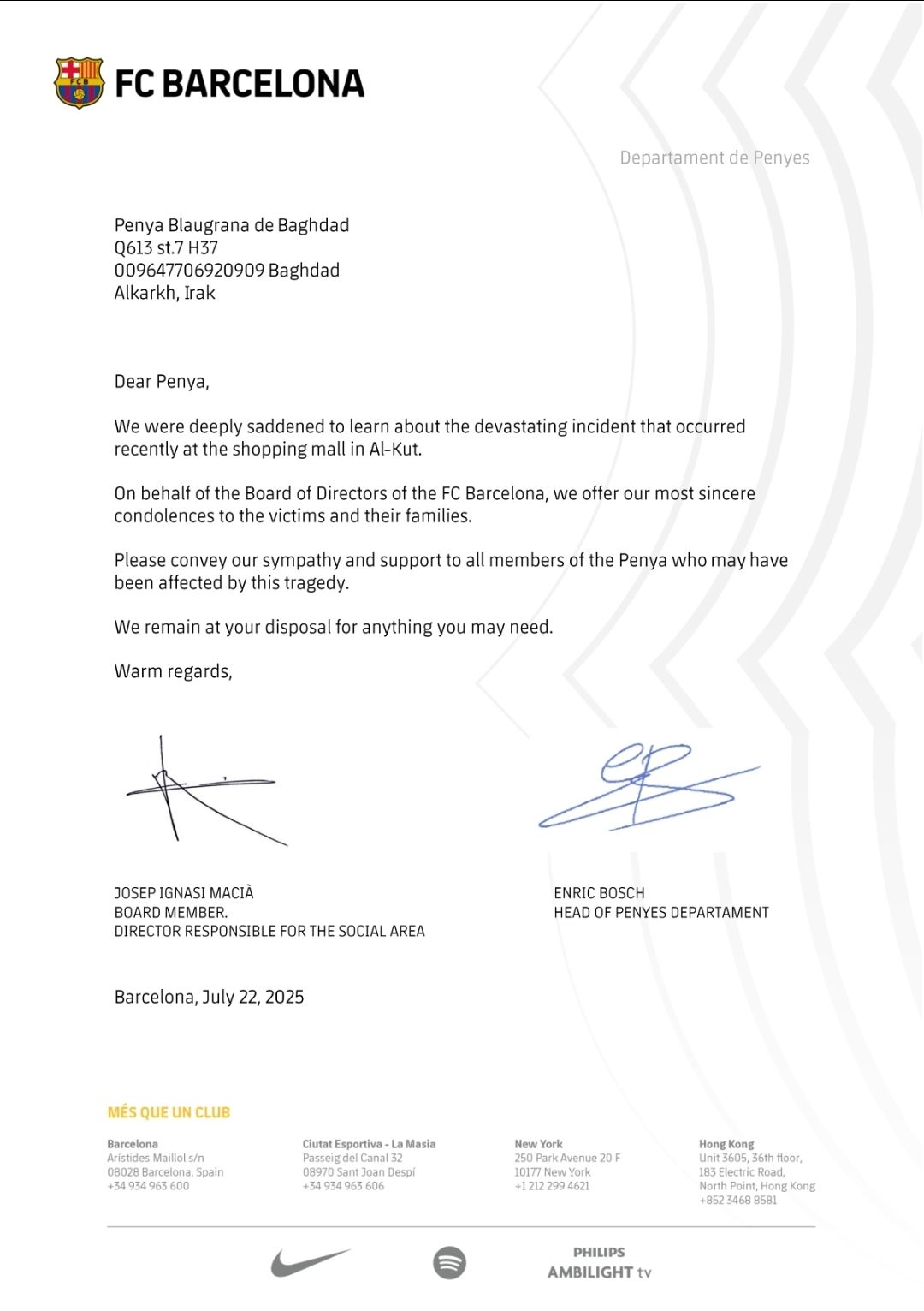 وذكرت رابطة "البلوغرانا" في بغداد عبر منشور على صفحتها في فيسبوك، أنها "تلقّت رسالة تعزية من نادي برشلونة الإسباني عبّر فيها عن بالغ أسفه وحزنه تجاه الأحداث المؤلمة التي شهدتها مدينة الكوت في العراق، مقدّماً خالص تعازيه إلى أهالي الضحايا والشعب العراقي أجمع".