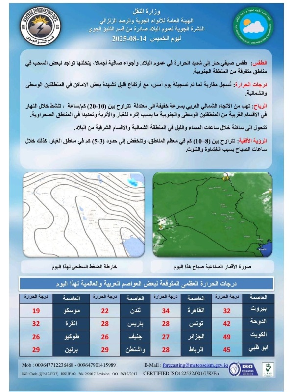 قالت هيئة الأنواء الجوية، اليوم الخميس (14 آب 2025) , إن تأثير الطقس الصيفي الحار جدًا على عموم البلاد مستمر ، ترافقه أجواء صافية فيما يتخللها تواجد لبعض السحب في مناطق متفرقة من المنطقة الجنوبية، فيما سجلت درجات الحرارة مقاربة لما تم تسجيله يوم أمس، مع ارتفاع طفيف تشهده بعض الأماكن في المنطقتين الوسطى والشمالية.