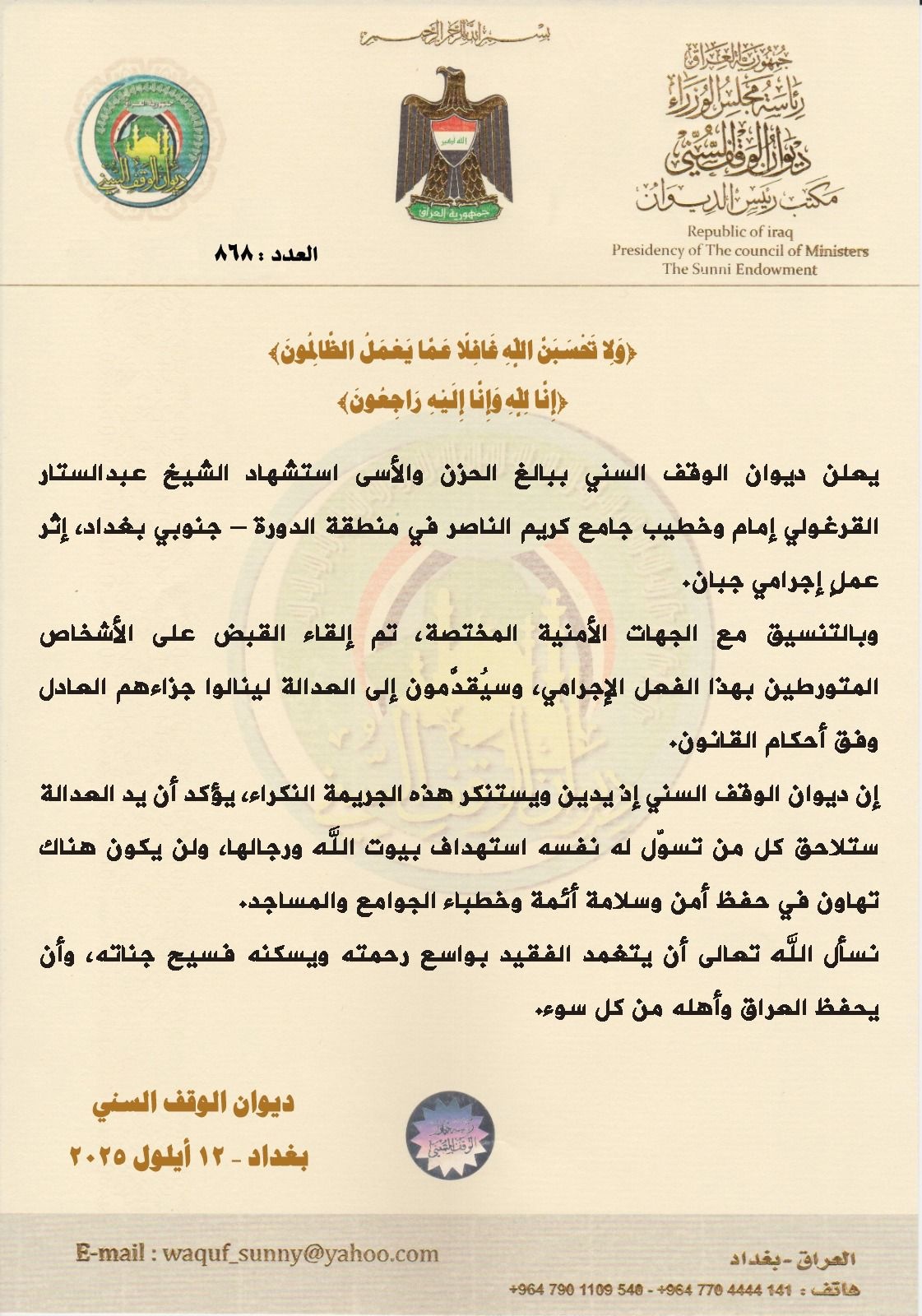 دوت رأس سطر // وصف ديوان الوقف السني، اليوم الجمعة، حادثة استشهاد الشيخ عبد الستار القرغولي، إمام وخطيب جامع كريم الناصر في منطقة الدورة جنوبي بغداد، بـ"عمل إجرامي جبان".