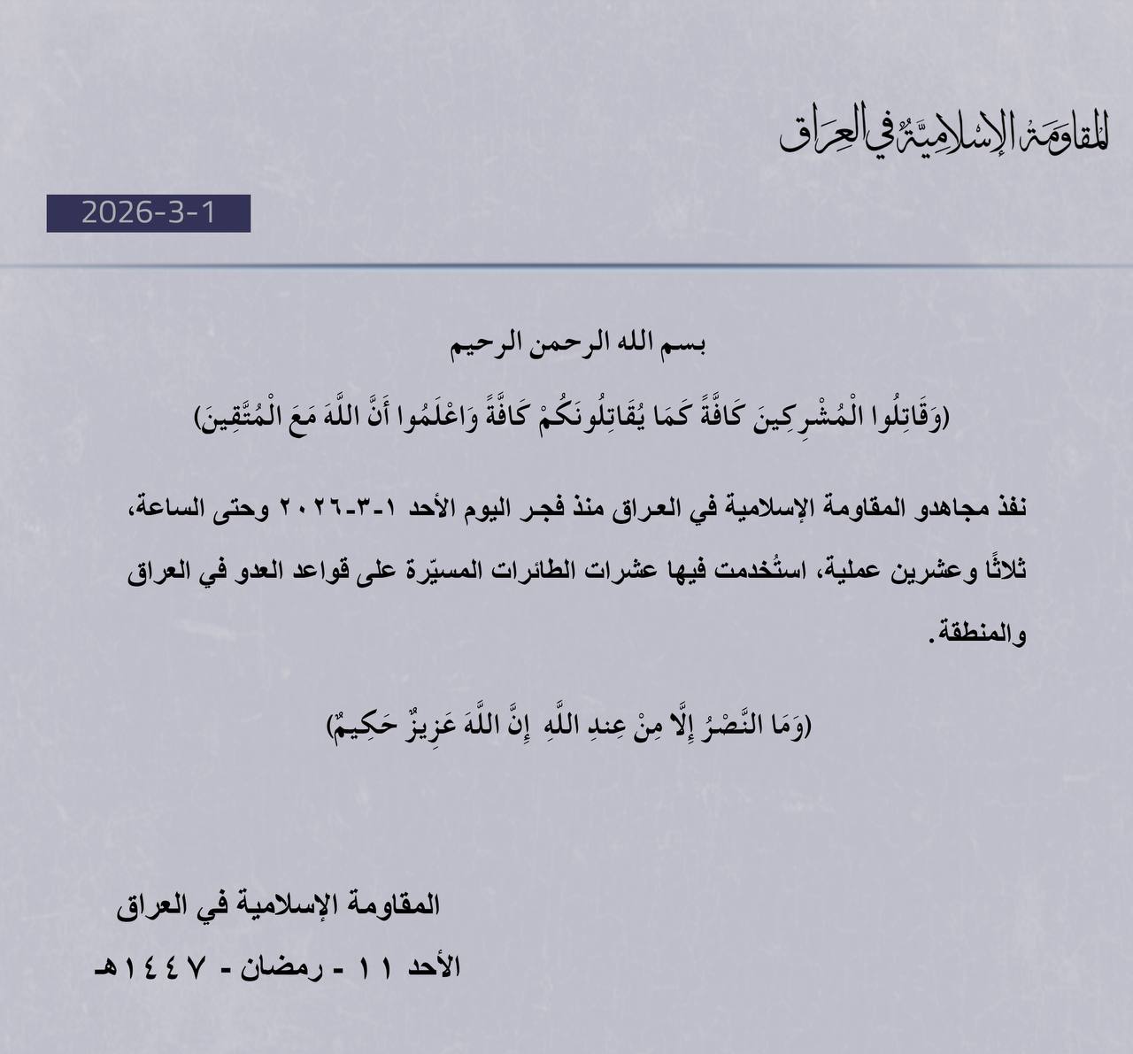 وذكرت "المقاومة"، في بيان ورد لوكالة دوت رأس سطر (درس)، أنهم "نفذوا منذ فجر اليوم الأحد 1-3-2026 وحتى الساعة، 23 عملية، استُخدمت فيها عشرات الطائرات المسيّرة على قواعد العدو في العراق والمنطقة".
