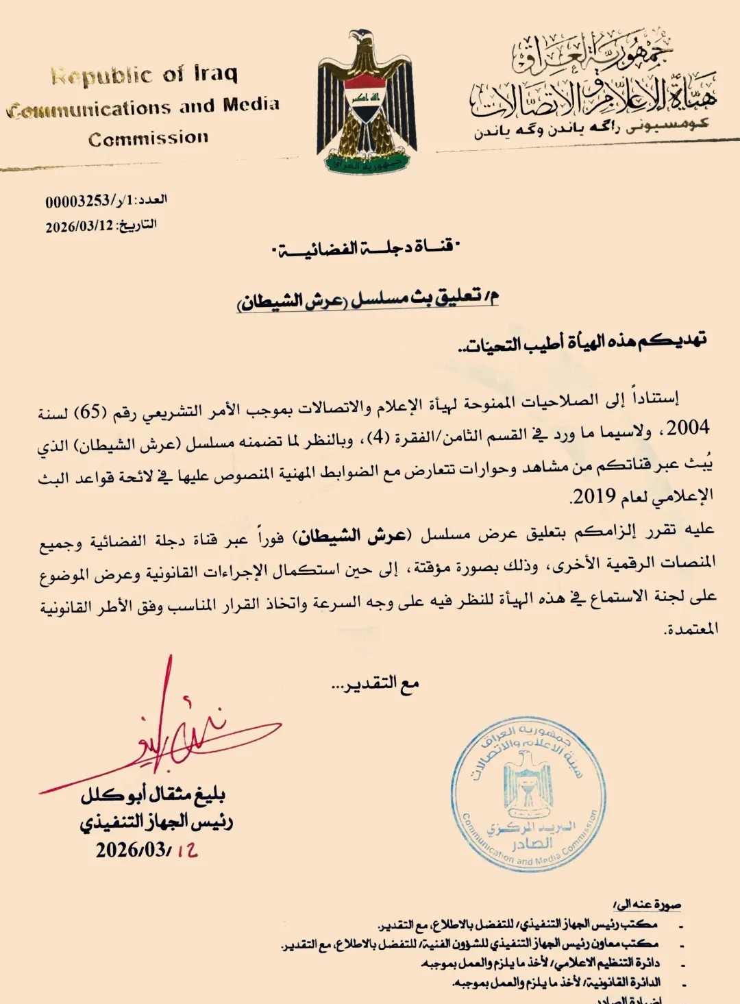 وبحسب وثيقة رسمية صادرة عن الهيئة وموقعة من رئيس الجهاز التنفيذي بليغ أبو كلل، تقرر تعليق عرض المسلسل فوراًوجميع المنصات الرقمية التابعة لها. وأوضحت الهيئة أن القرار جاء استناداً إلى الصلاحيات الممنوحة لها بموجب الأمر التشريعي رقم (65) لسنة 2004، ولاسيما ما ورد في القسم الثامن الفقرة (4)، بعد تضمّن المسلسل مشاهد وحوارات تتعارض مع الضوابط المهنية المنصوص عليها في لائحة قواعد البث الإعلامي لعام 2019.