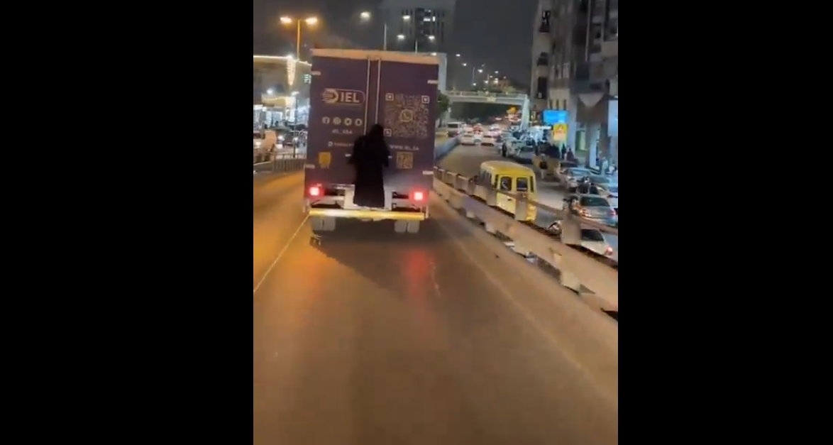 وأظهر الفيديو سيدة ترتدي عباءة سوداء وهي متعلقة بالباب الخلفي لشاحنة ويسير قائدها على طريق سريع مخصص للسيارات وسط المنطقة المركزية التجارية.