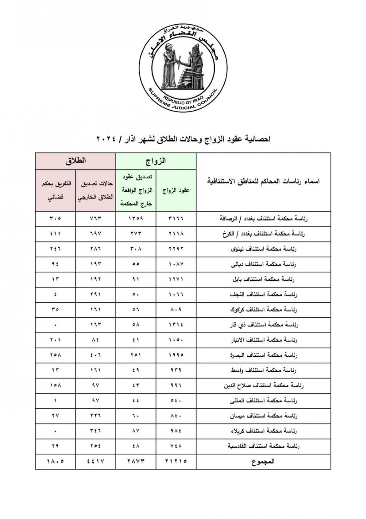 القضاء ينشر احصائية الزواج والطلاق لشهر اذار الماضي